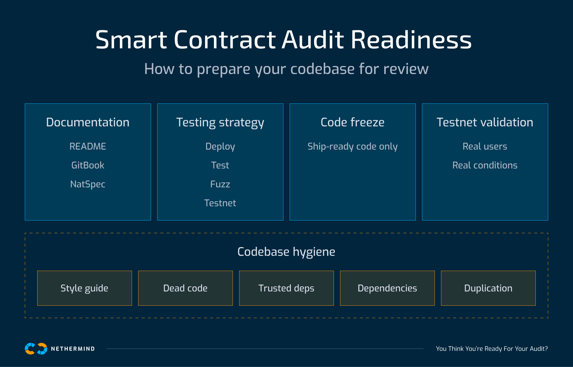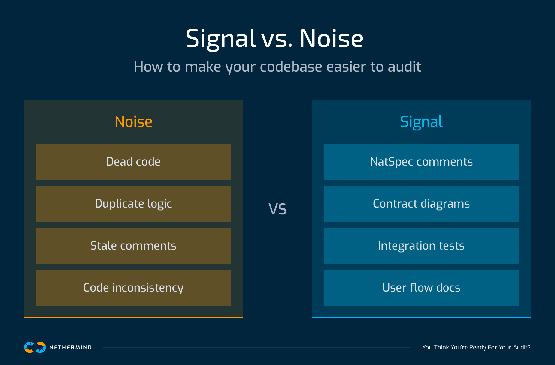 If you apply all these points before your audit begins, you will be in a much better position when the code review starts. The signal-to-noise ratio of your codebase doesn't just affect how deep auditors go. It affects what they find. A noisy codebase doesn't produce a worse report because auditors miss things. It produces one because their time went to the wrong places. Every improvement you make, whether removing dead code, tightening your documentation, or validating on testnet, is time handed back to the people looking for real issues.